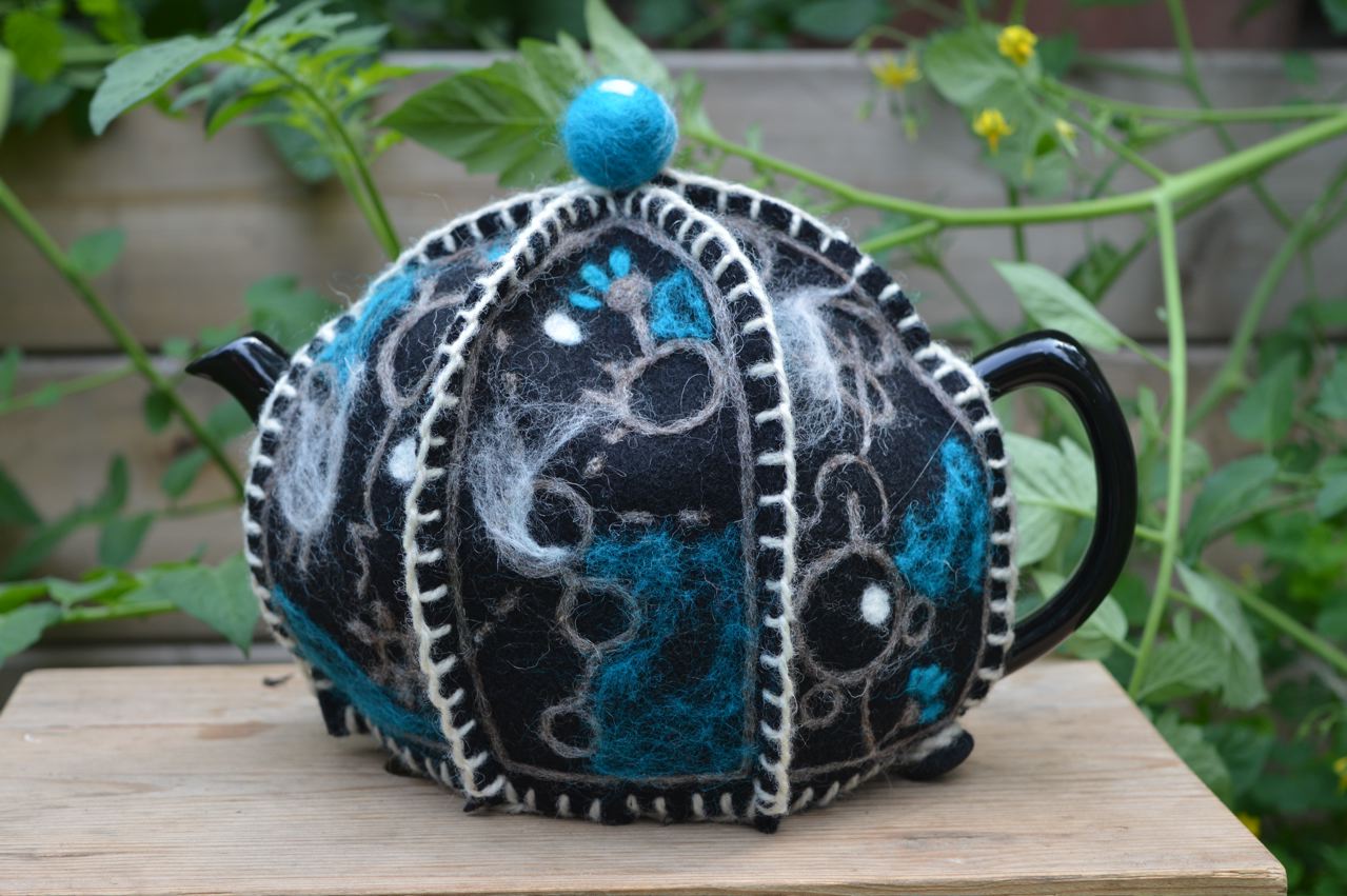 Re-purposed wool coat, wool yarn and roving from P.E.I., and a velvet button.