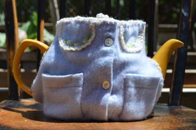 Re-purposed cashmere sweater and faux pearls, wool yarn and roving from P.E.I, buttons, and ribbon.