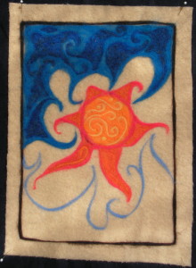 Re-purposed wool blanket, wool roving from New Zealand and Nova Scotia.