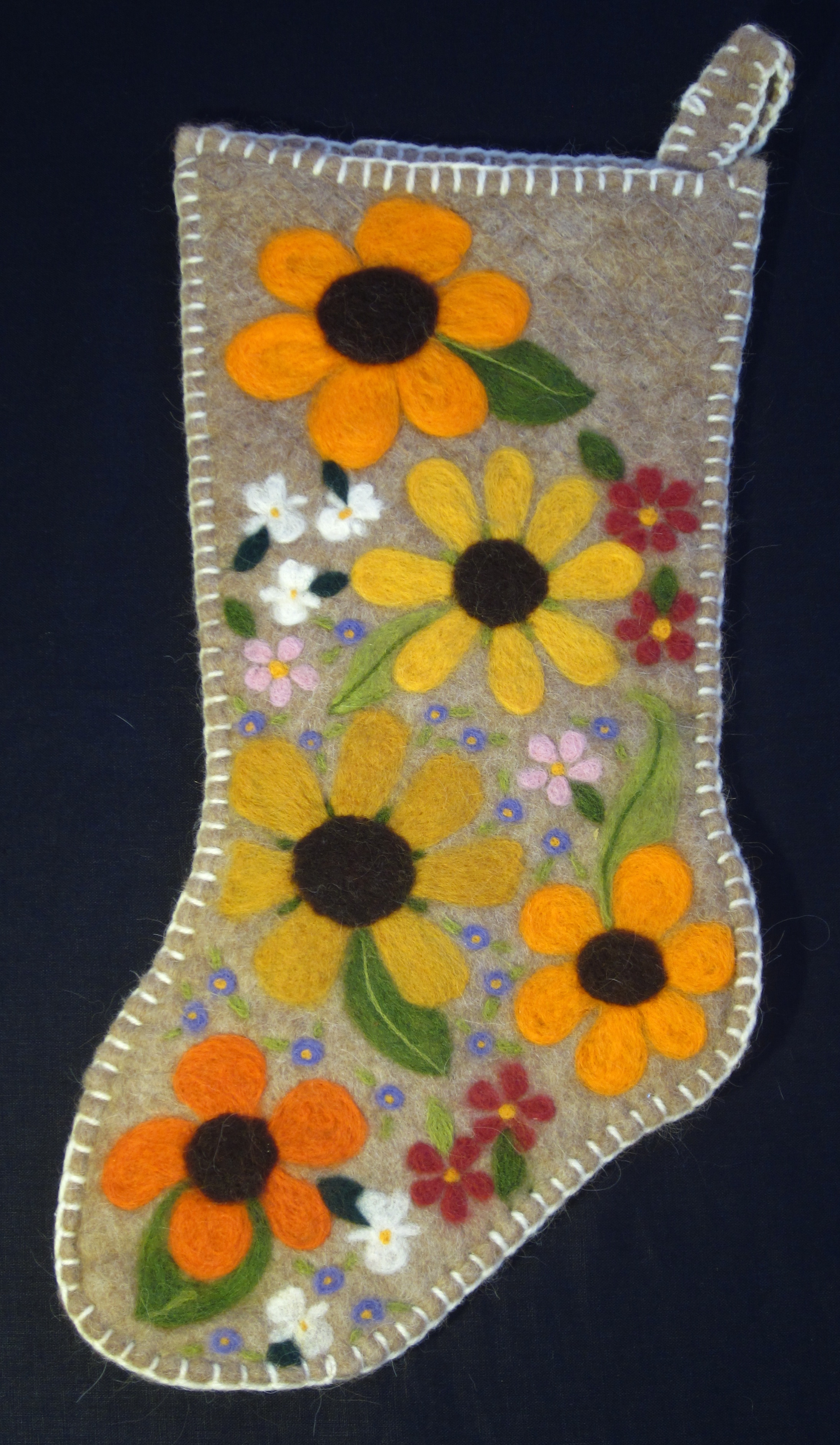 Needle felted stocking made with alpaca felt from Ontario, wool roving and wool yarn from Nova Scotia and New Zealand, and cotton lined. Approximate dimensions 12″ x 18″ – Sold